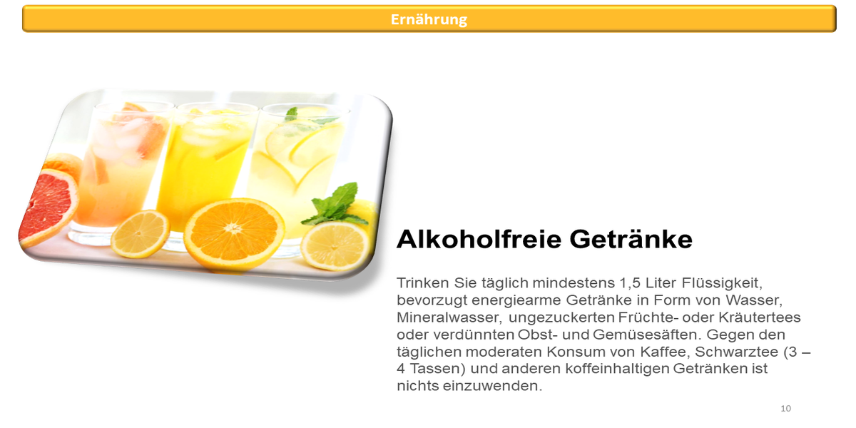 Etwa 1,5 bis 2 Liter Wasser oder ungesüßten Tee pro Tag trinken.